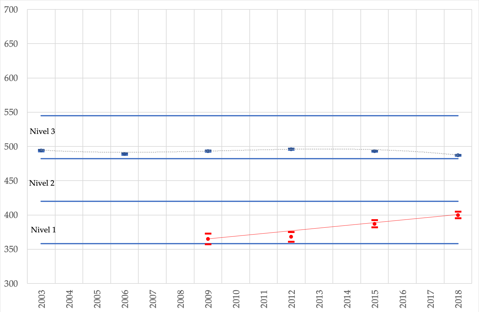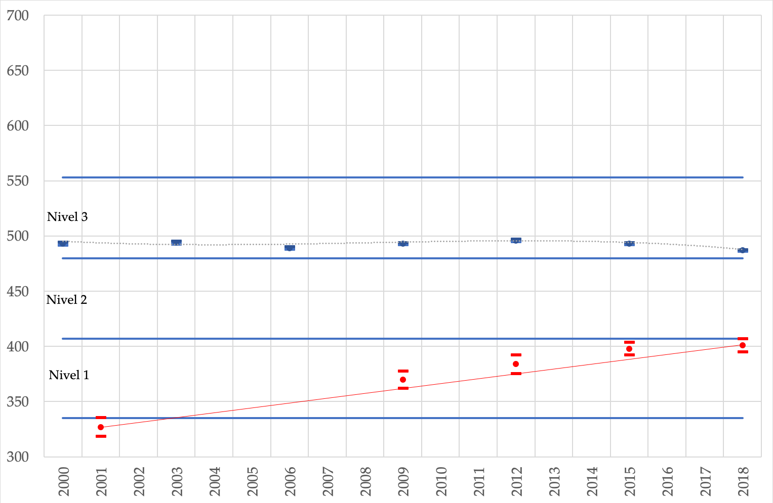 | Puntajes medios de la OECD y del Perú en la escala combinada de ciencias de PISA. 2000-2018. Las líneas horizontales marcan los límites superiores de los primeros tres niveles de desempeño definidos en 2000. Los puntos marcan el valor del estimador y las líneas los límites de los intervalos de confianza de la estimación (alpha: 0,05). |